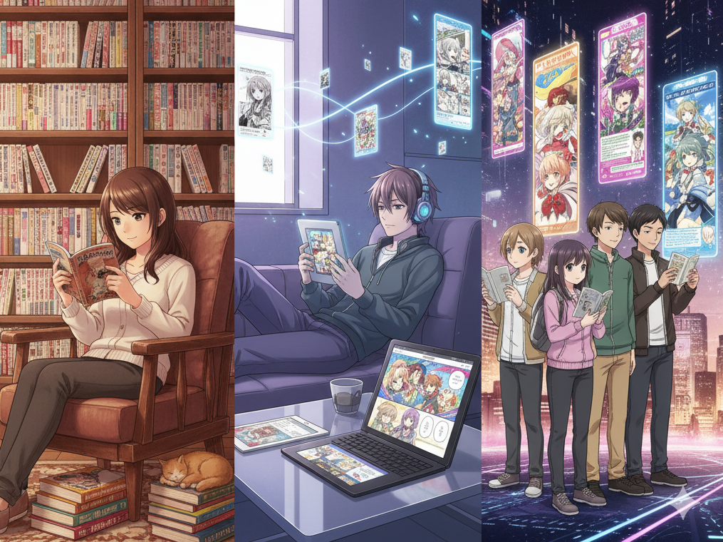漫画の読書スタイルは、この数十年の間に劇的に変化しました。従来の主流であった単行本や雑誌といった「紙媒体」には、ページをめくる感触、本棚に並べる喜び、そして中古市場での取引といった独自の魅力があります。