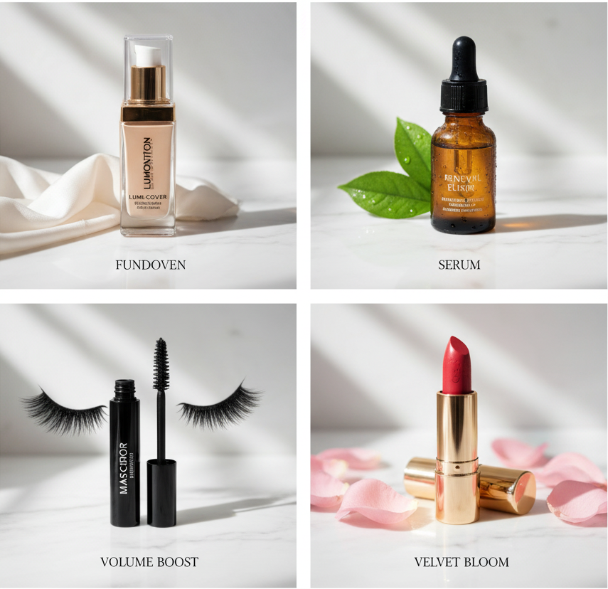 • (例6)美容液成分入りファンデーション: メイクしながらスキンケア効果も期待できるリキッドファンデーション。ツヤのある仕上がりで、乾燥による小ジワを目立たなくさせるように見せる効果が期待できます。