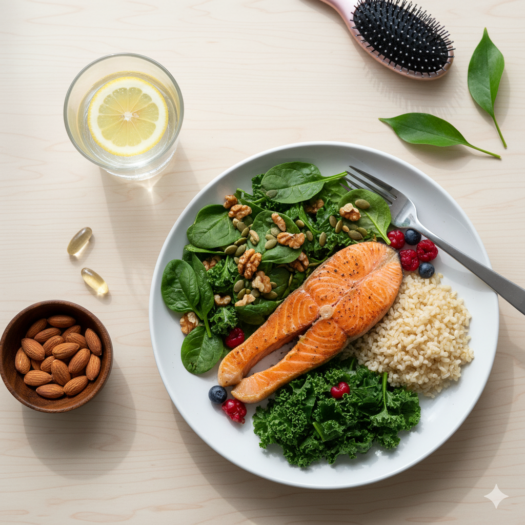髪の主成分は約8割が「ケラチン」というタンパク質でできています。健康で丈夫な髪を育むためには、まず良質なタンパク質を毎日の食事でしっかりと摂取することが大切です。肉、魚、卵、大豆製品などをバランス良く取り入れましょう。