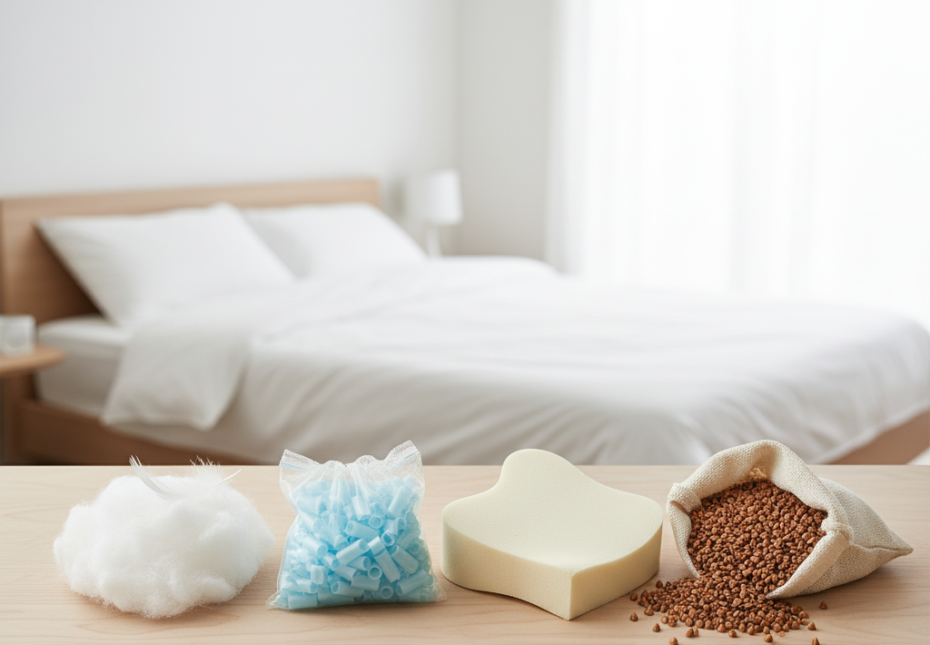 枕の硬さは、主に中材(枕の中身)の種類によって決まります。硬すぎる枕は頭が安定しにくく、圧迫感を感じることがあります。一方で柔らかすぎる枕は、頭が沈み込みすぎてしまい、首の支えが不十分になる可能性があります。