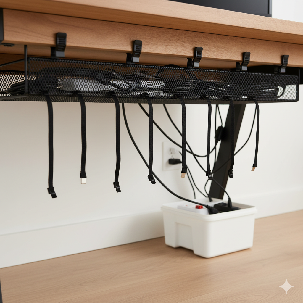 最も効果的な解決策は、ケーブルをデスクの天板裏や床から離れた場所にまとめて隠してしまうことです。デスクの裏に取り付けられる**ケーブルトレイ**や、電源タップごと収納できる**ケーブルボックス**を使えば、床にコードが散乱するのを防ぎ、見た目が劇的にすっきりします。