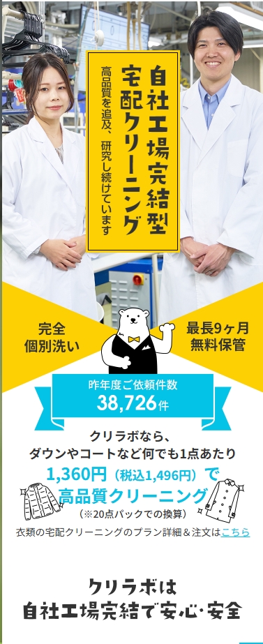 - 完全個別洗浄: 他の顧客の衣類と一緒に洗うことはありません。一人の顧客の衣類だけを、その状態に合わせて個別に洗浄します。